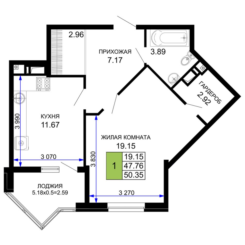 1-комнатная — 50,9 м² 2/12 эт. в Сегодня
