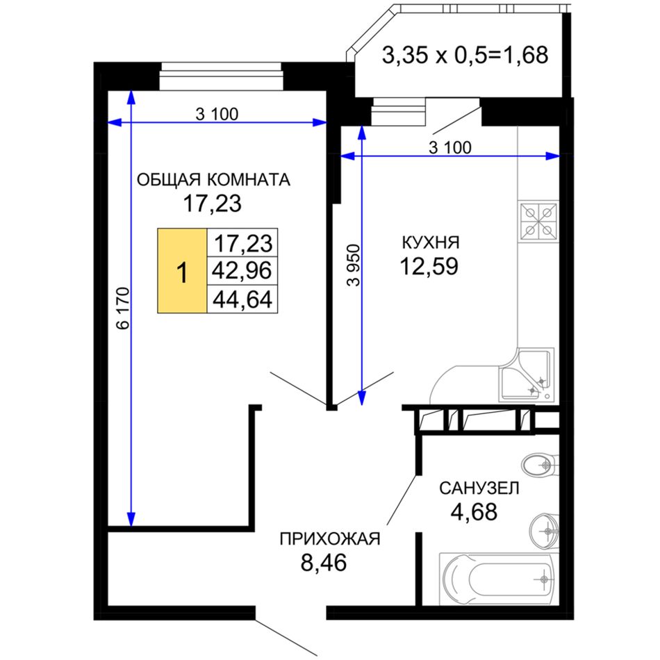 1-комнатная — 44,15 м² 3/19 эт. в Лучший