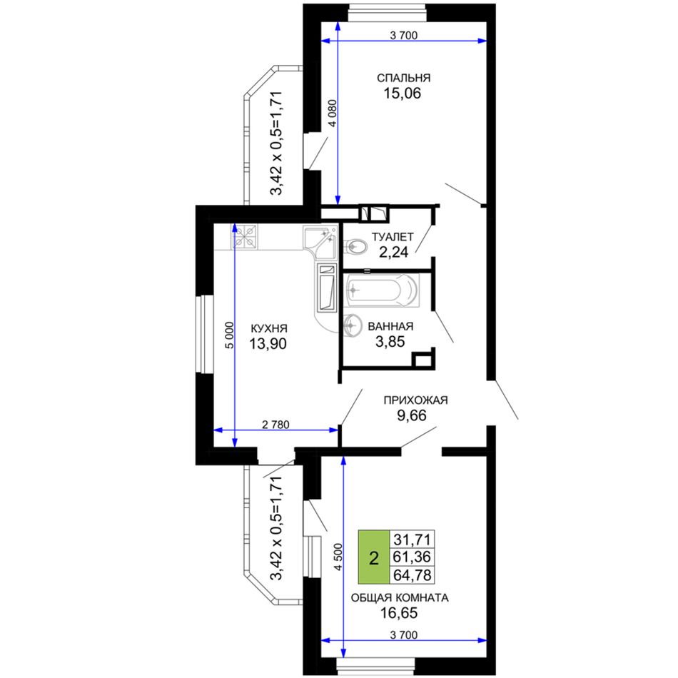 2-комнатная — 63,35 м² 2/19 эт. в Лучший