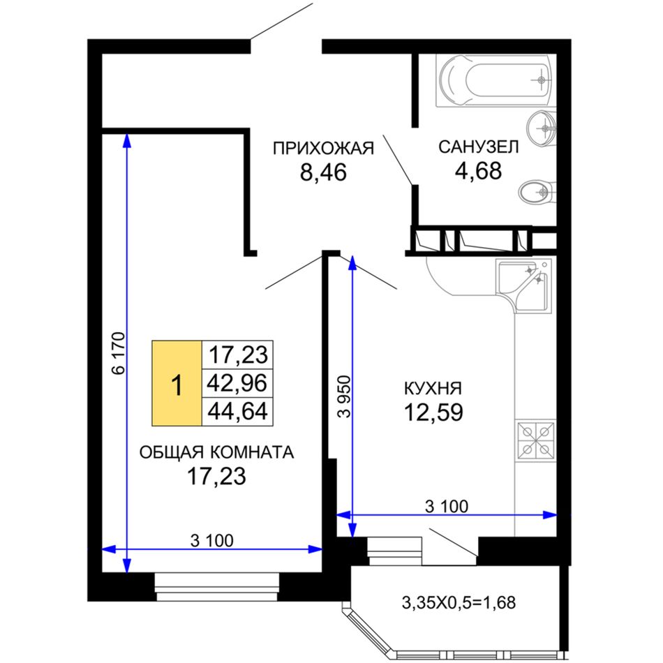 1-комнатная — 44,25 м² 11/19 эт. в Лучший