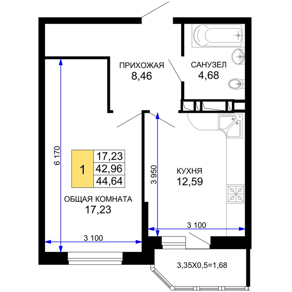 1-комнатная — 44,35 м² 7/19 эт. в Лучший