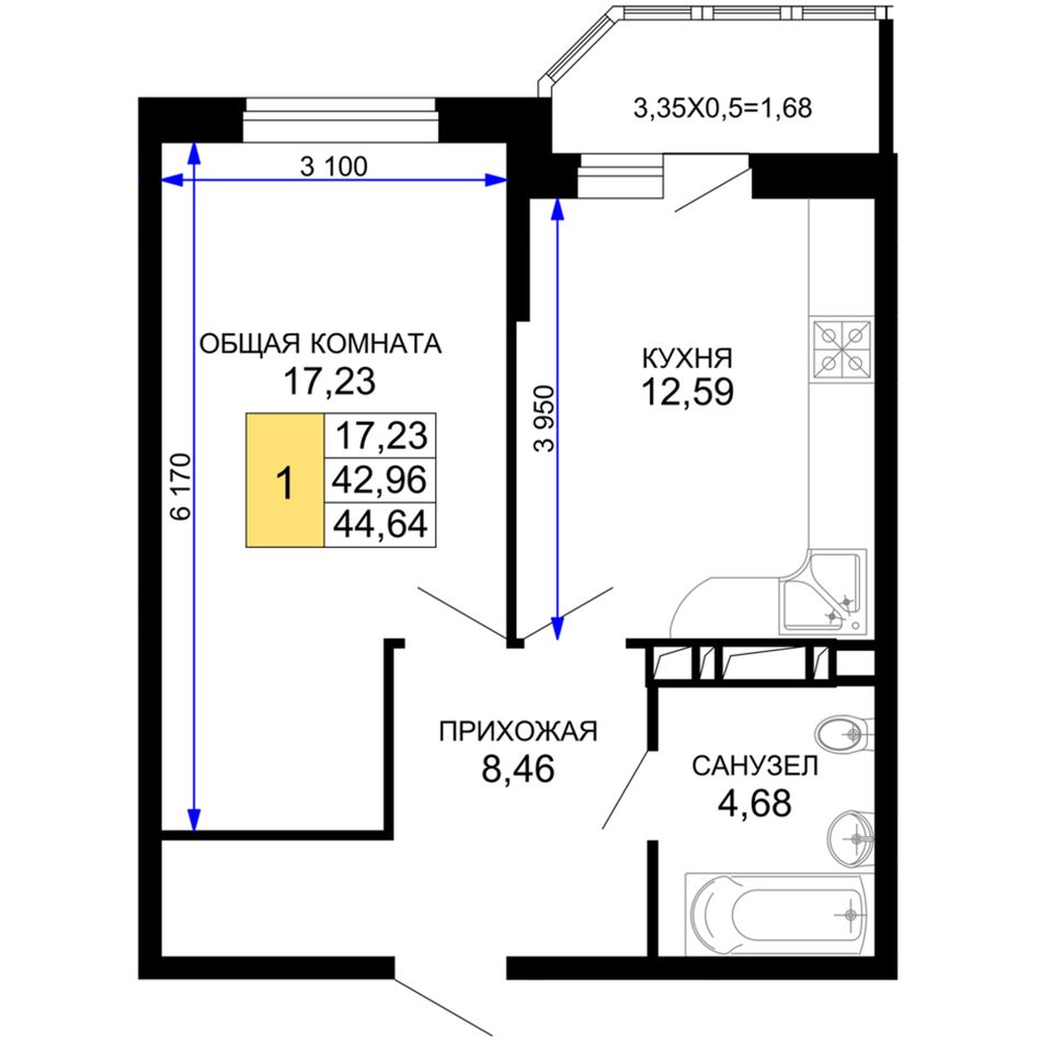 1-комнатная — 44,05 м² 2/19 эт. в Лучший