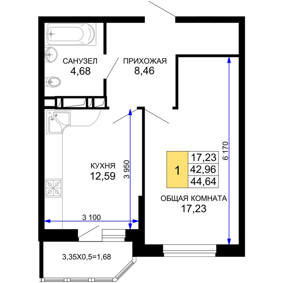 1-комнатная — 44,35 м² 8/19 эт. в Лучший