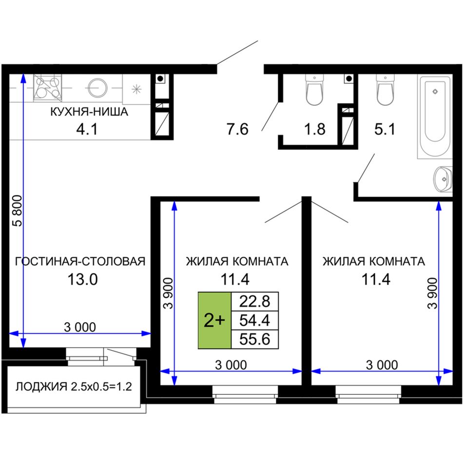 2-комнатная — 55,55 м² 12/16 эт. в Дыхание