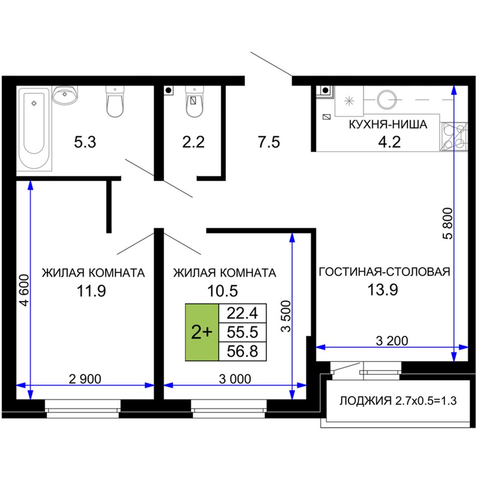 2-комнатная — 58 м² 2/16 эт. в Дыхание