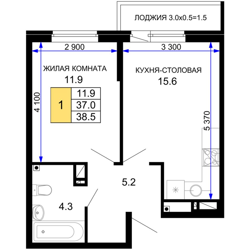 1-комнатная — 38,8 м² 12/16 эт. в Дыхание