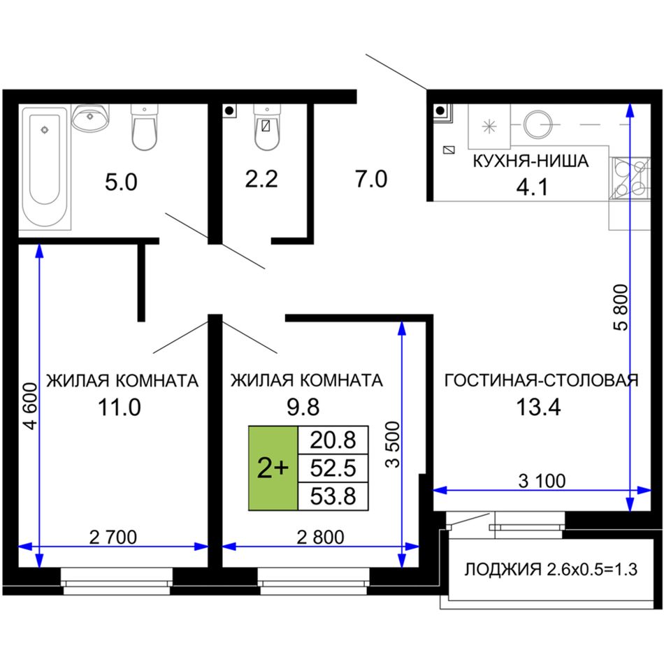 2-комнатная — 55,25 м² 2/16 эт. в Дыхание