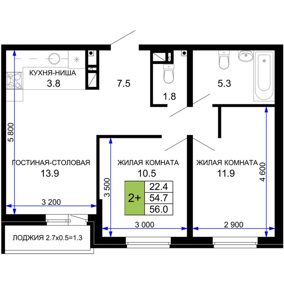 2-комнатная — 56,9 м² 11/16 эт. в Дыхание