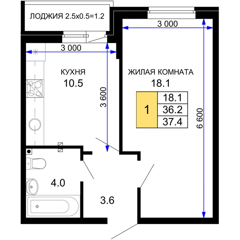 1-комнатная — 37,85 м² 2/16 эт. в Дыхание
