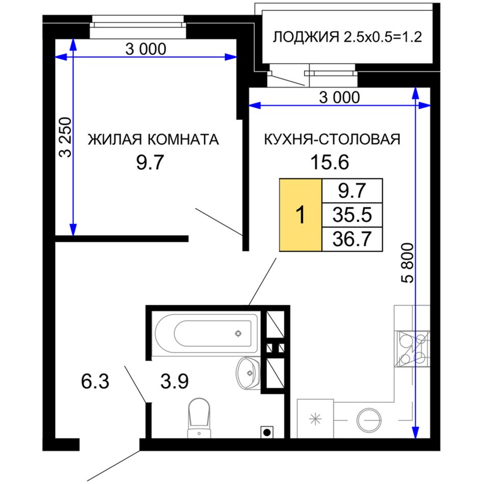 1-комнатная — 37,05 м² 3/16 эт. в Дыхание