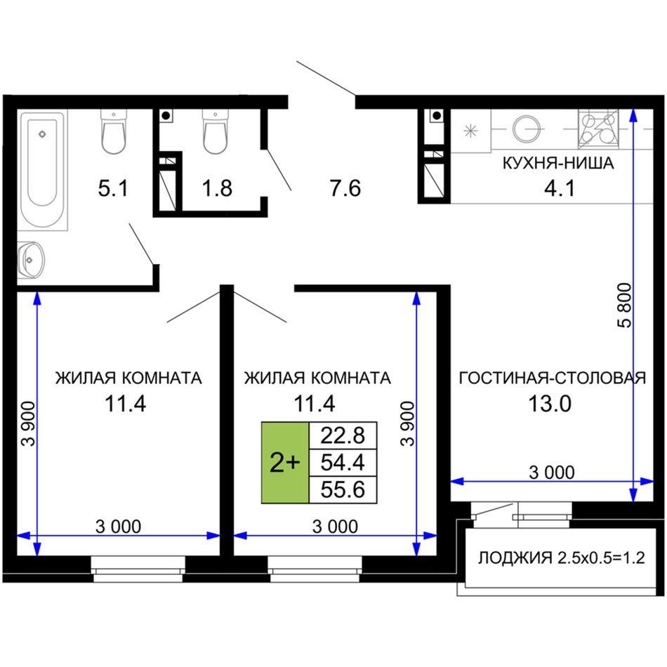 2-комнатная — 55,85 м² 8/16 эт. в Дыхание