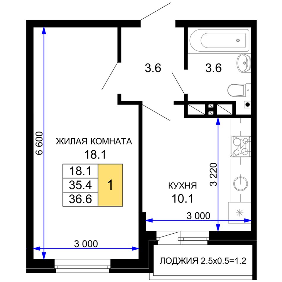 1-комнатная — 37,15 м² 14/16 эт. в Дыхание