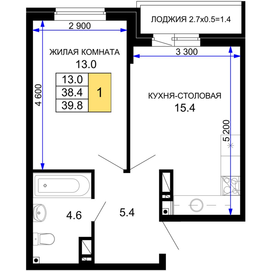 1-комнатная — 40,25 м² 16/16 эт. в Дыхание