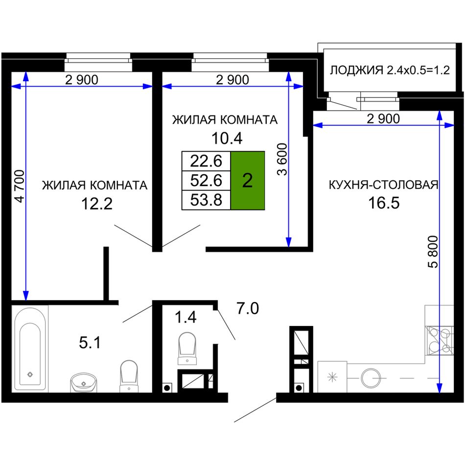 2-комнатная — 54,1 м² 7/16 эт. в Дыхание
