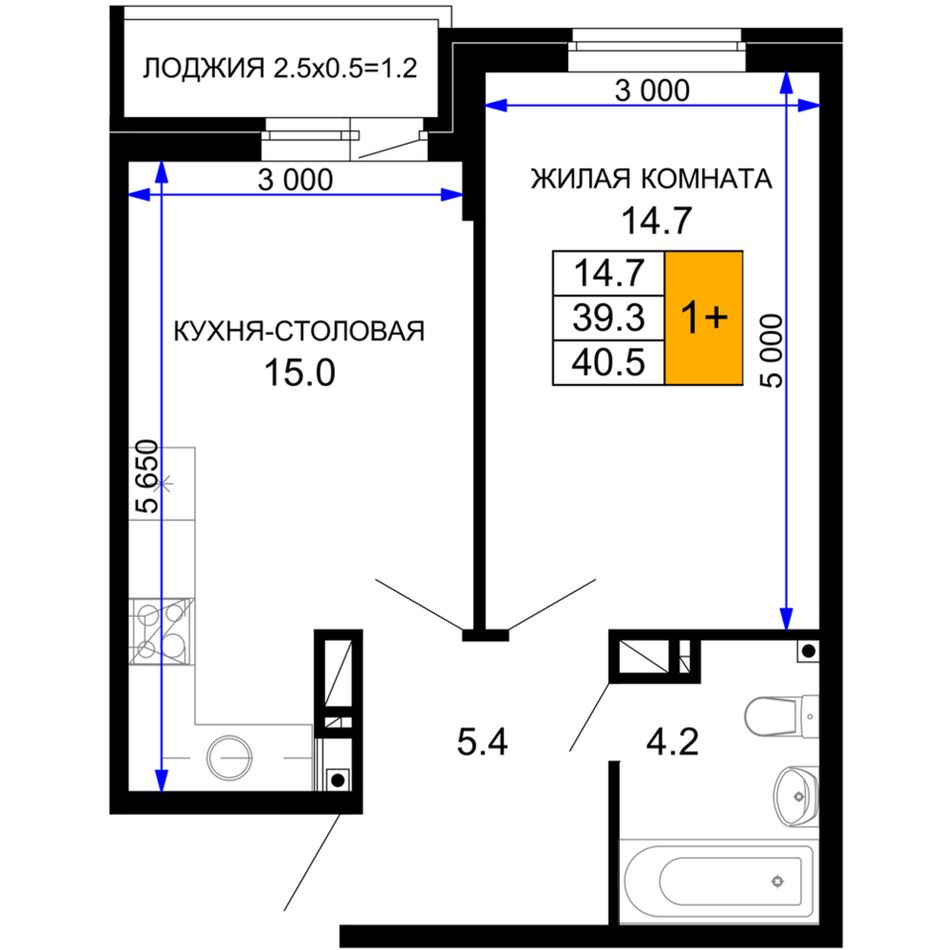 1-комнатная — 40,75 м² 9/16 эт. в Дыхание
