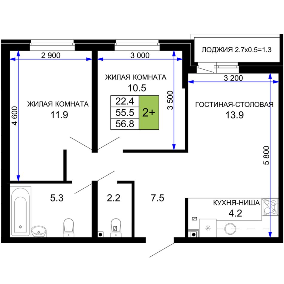 2-комнатная — 58,05 м² 2/16 эт. в Дыхание