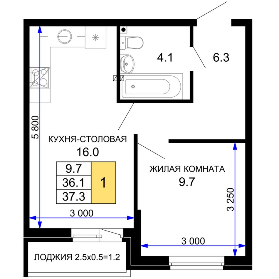 1-комнатная — 37,55 м² 2/16 эт. в Дыхание