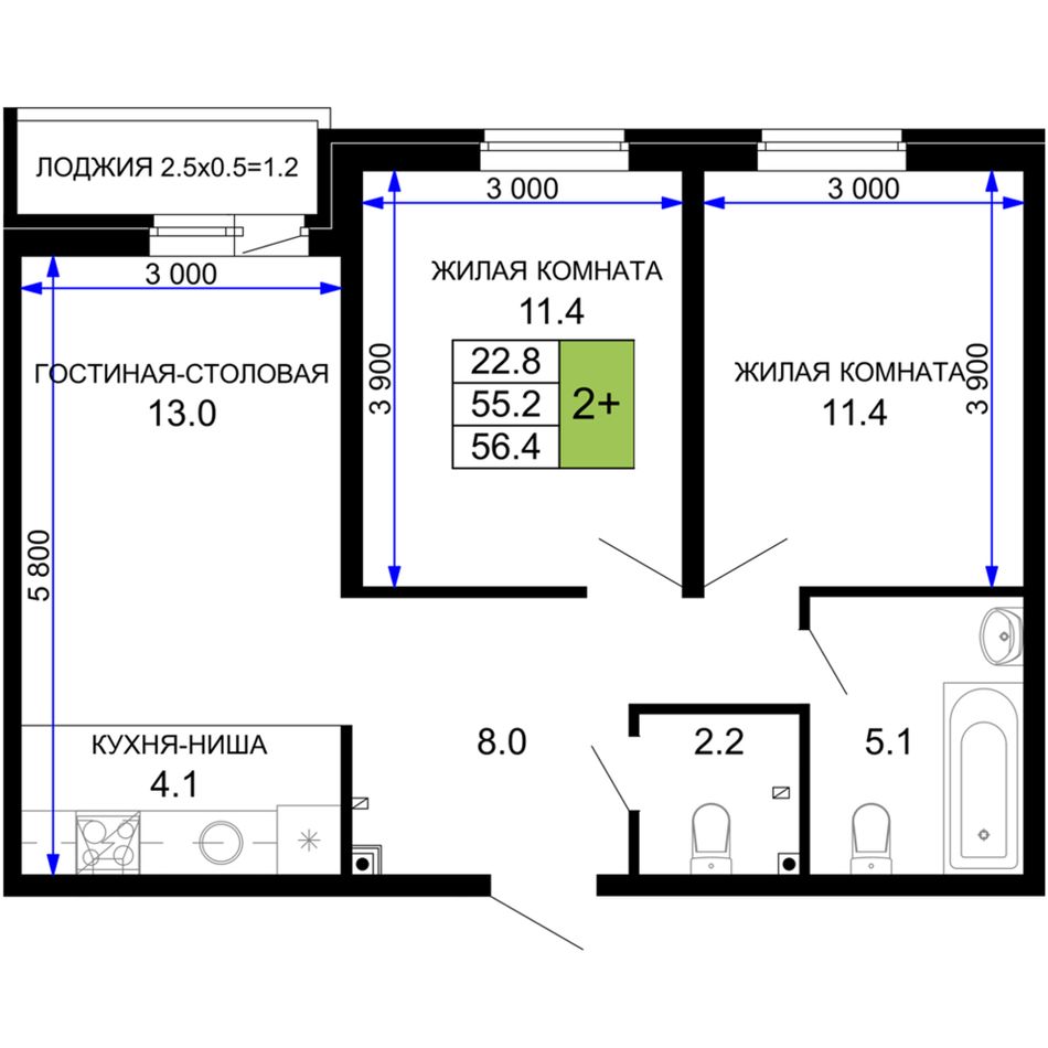 2-комнатная — 57,05 м² 2/16 эт. в Дыхание