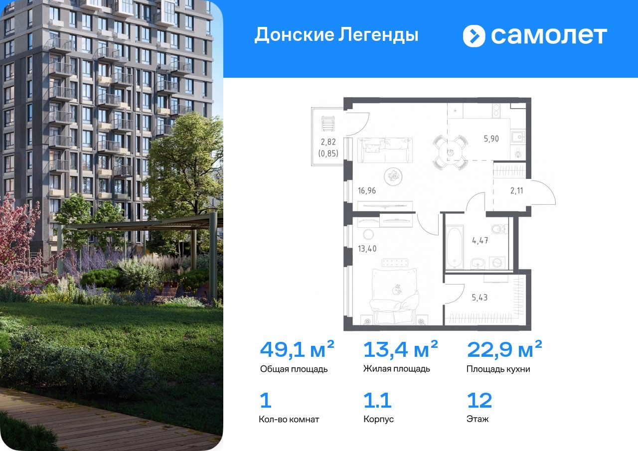 Предлагается 1-комнатная квартира комфорт-класса 49,12 кв.м в корпусе 1.1 на 12 этаже, в ЖК «Донские Легенды»