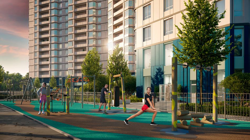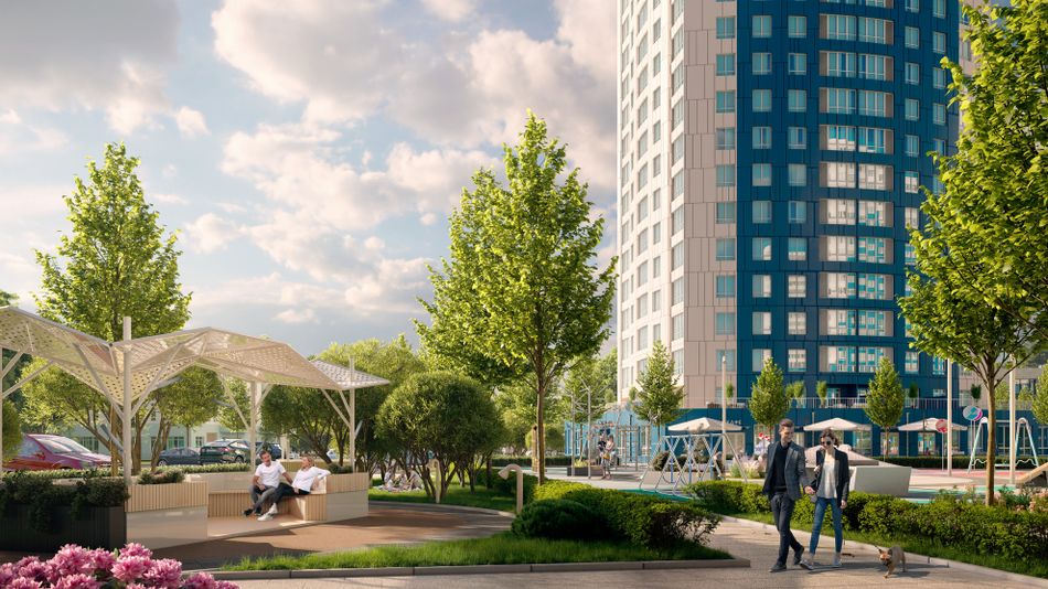 Благоустройство ЖК «Дыхание» впечатляет! Три детских садика, школа, большая торговая галерея, яблоневый сад и прогулочные аллеи с перголами ...