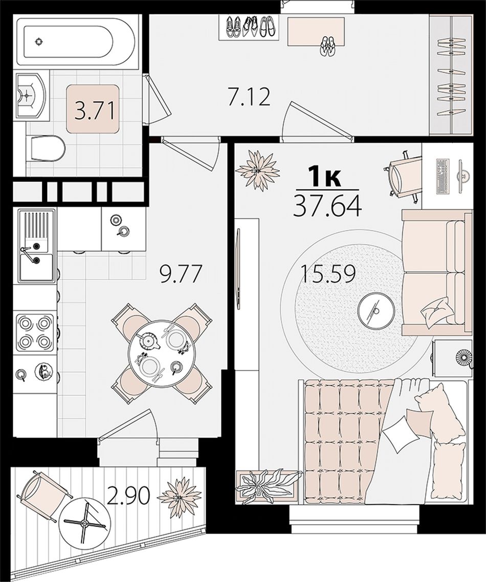 1-комнатная — 37,15 м² 12/12 эт. в Дом на Луговой