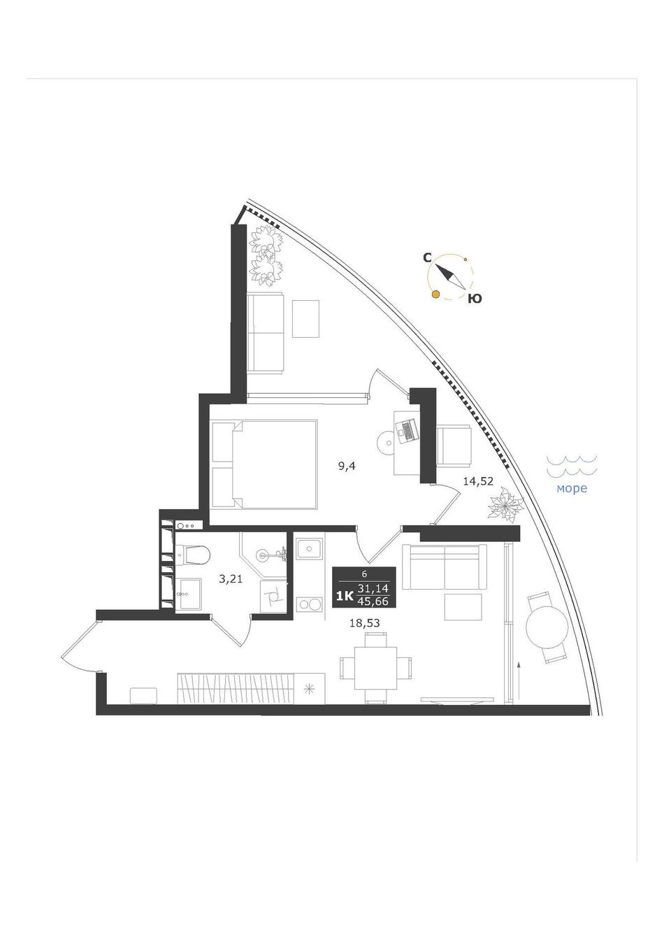 1-комнатная — 45,66 м² 2/11 эт. в Паруса мечты