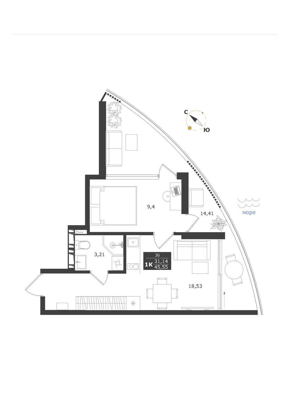 1-комнатная — 45,55 м² 5/11 эт. в Паруса мечты