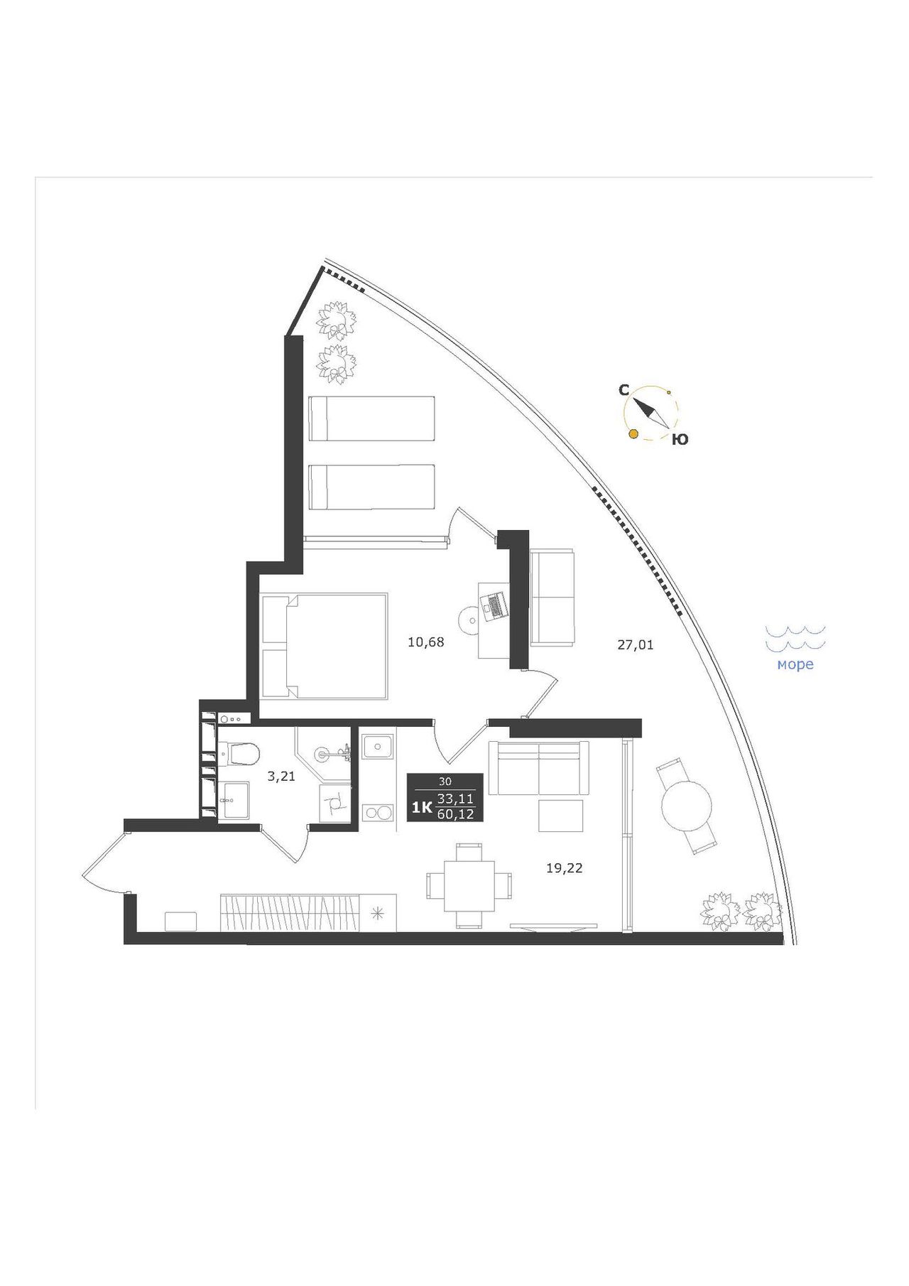 1-комнатная — 60,12 м² 5/11 эт. в Паруса мечты