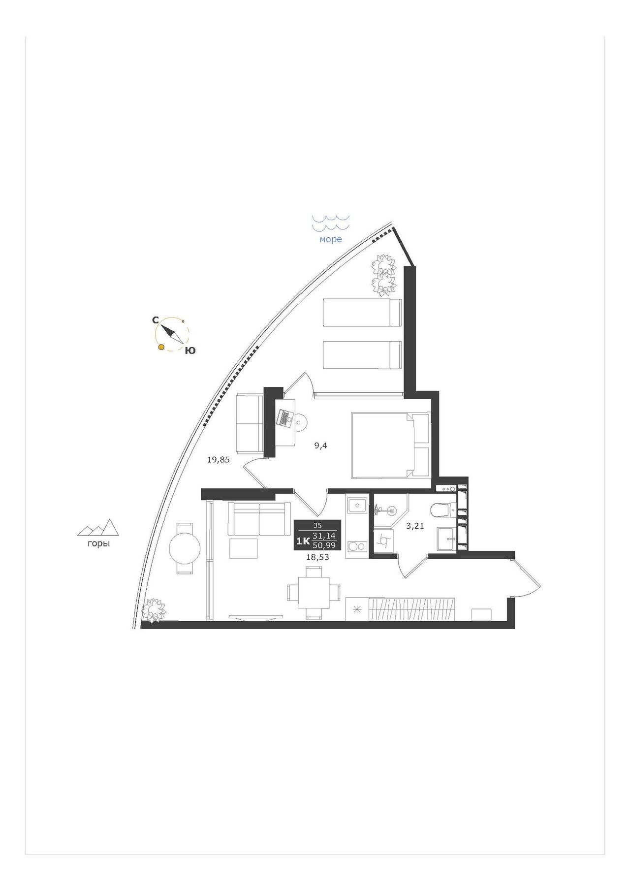 1-комнатная — 50,99 м² 6/11 эт. в Паруса мечты