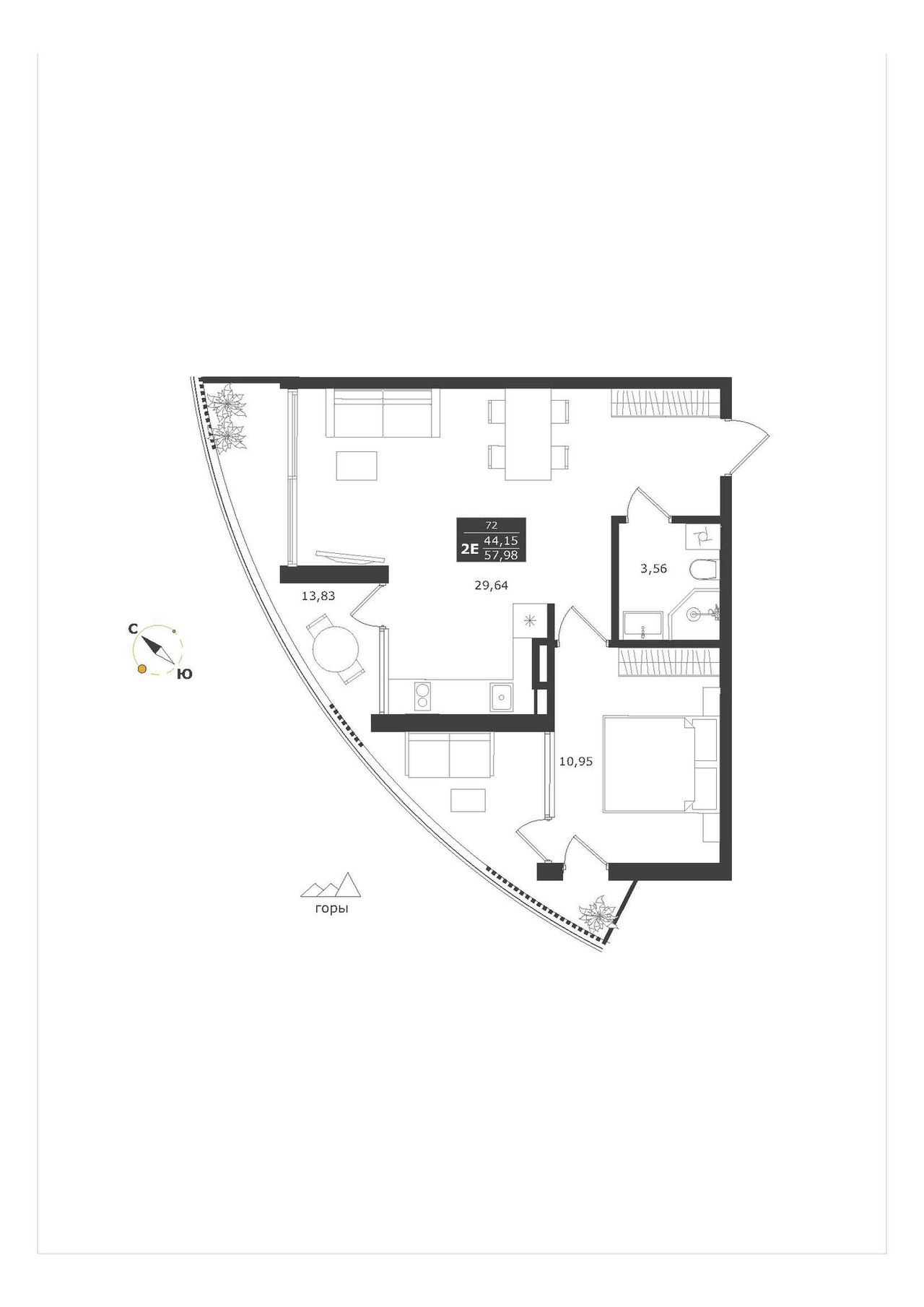 2-комнатная — 57,98 м² 11/11 эт. в Паруса мечты