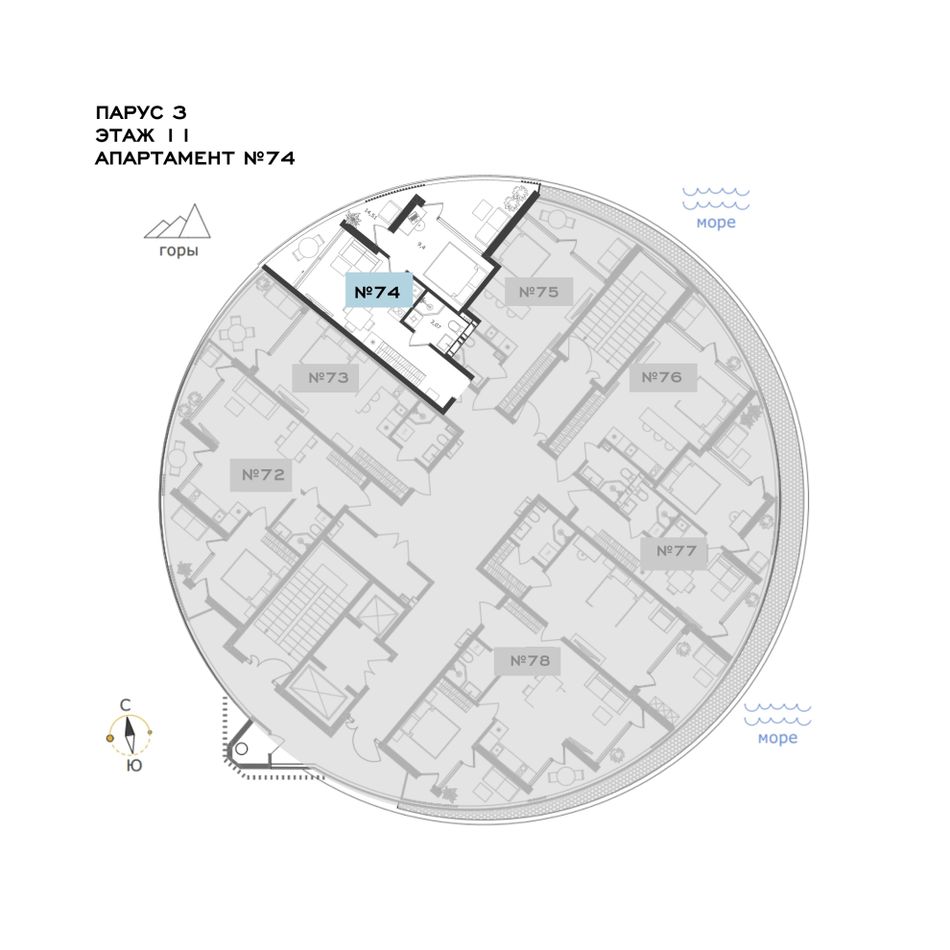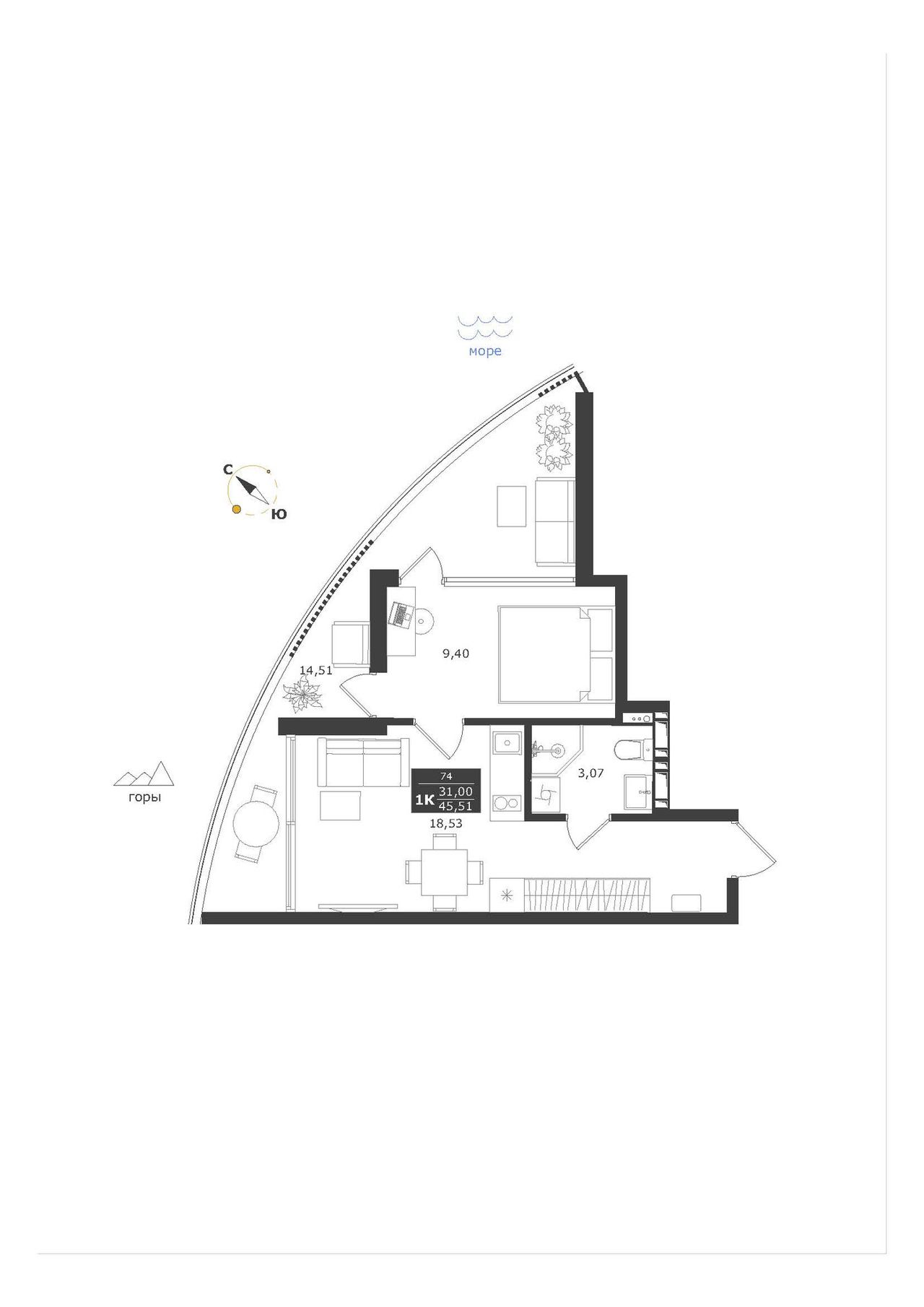 1-комнатная — 45,51 м² 11/11 эт. в Паруса мечты
