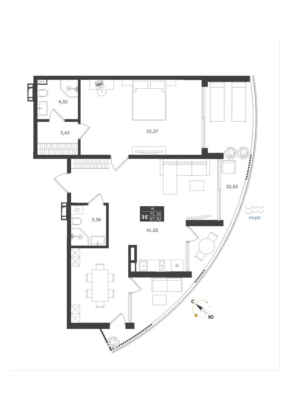 3-комнатная — 97,92 м² 11/11 эт. в Паруса мечты