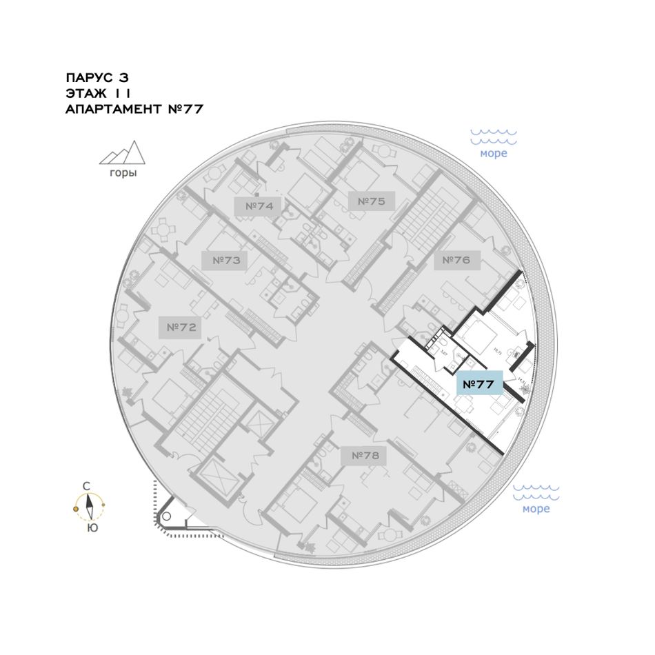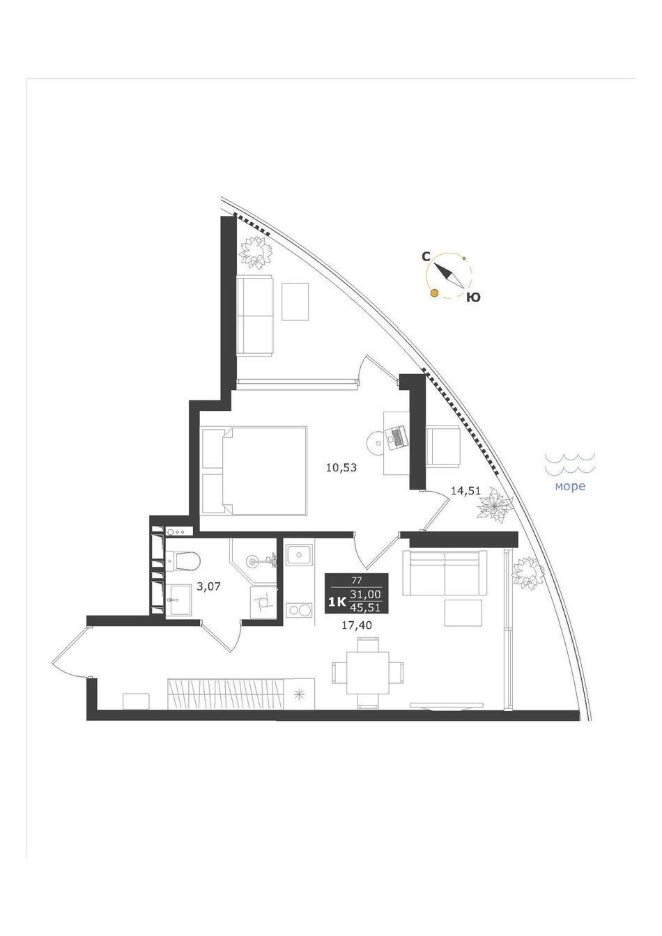 1-комнатная — 45,51 м² 11/11 эт. в Паруса мечты