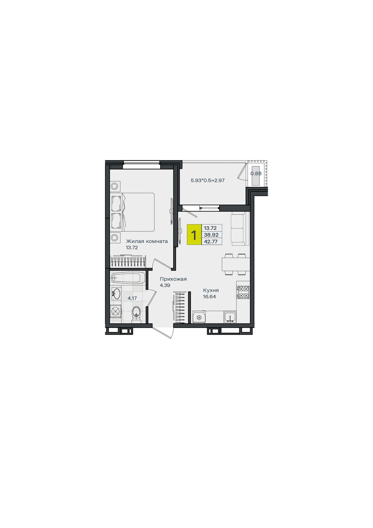 1-комнатная — 42,77 м² 4/8 эт. в МОНО Квартал