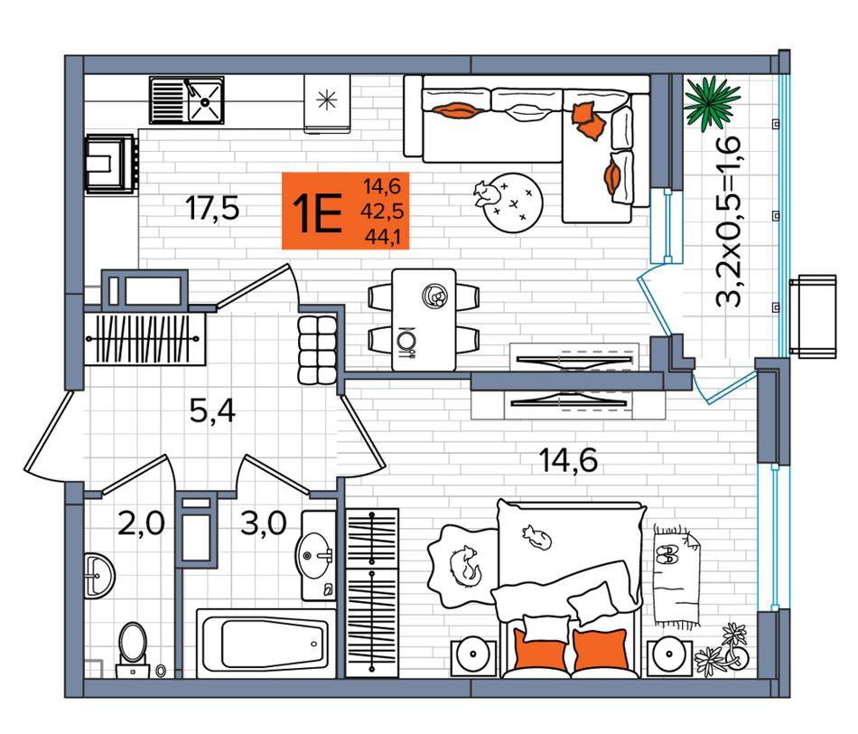1-комнатная — 44,1 м² 15/16 эт. в Сармат