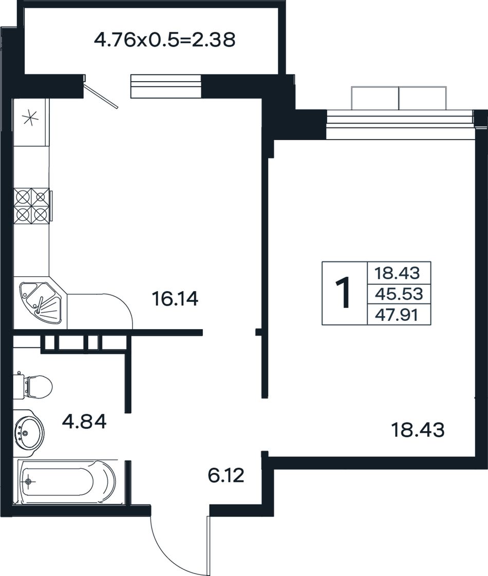 1-комнатная — 47,91 м² 4/12 эт. в ЭНДЕМИК
