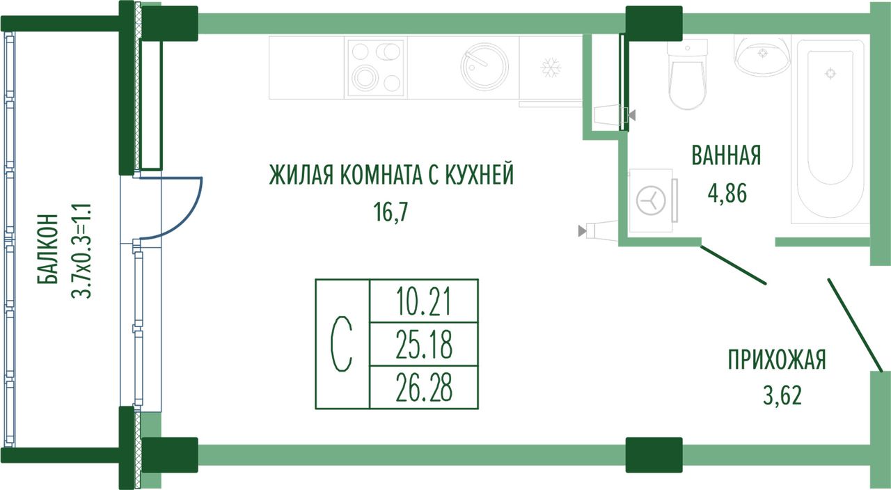 Студия | 23 - 28 м² | 3,7 - 4,4 млн ₽ |