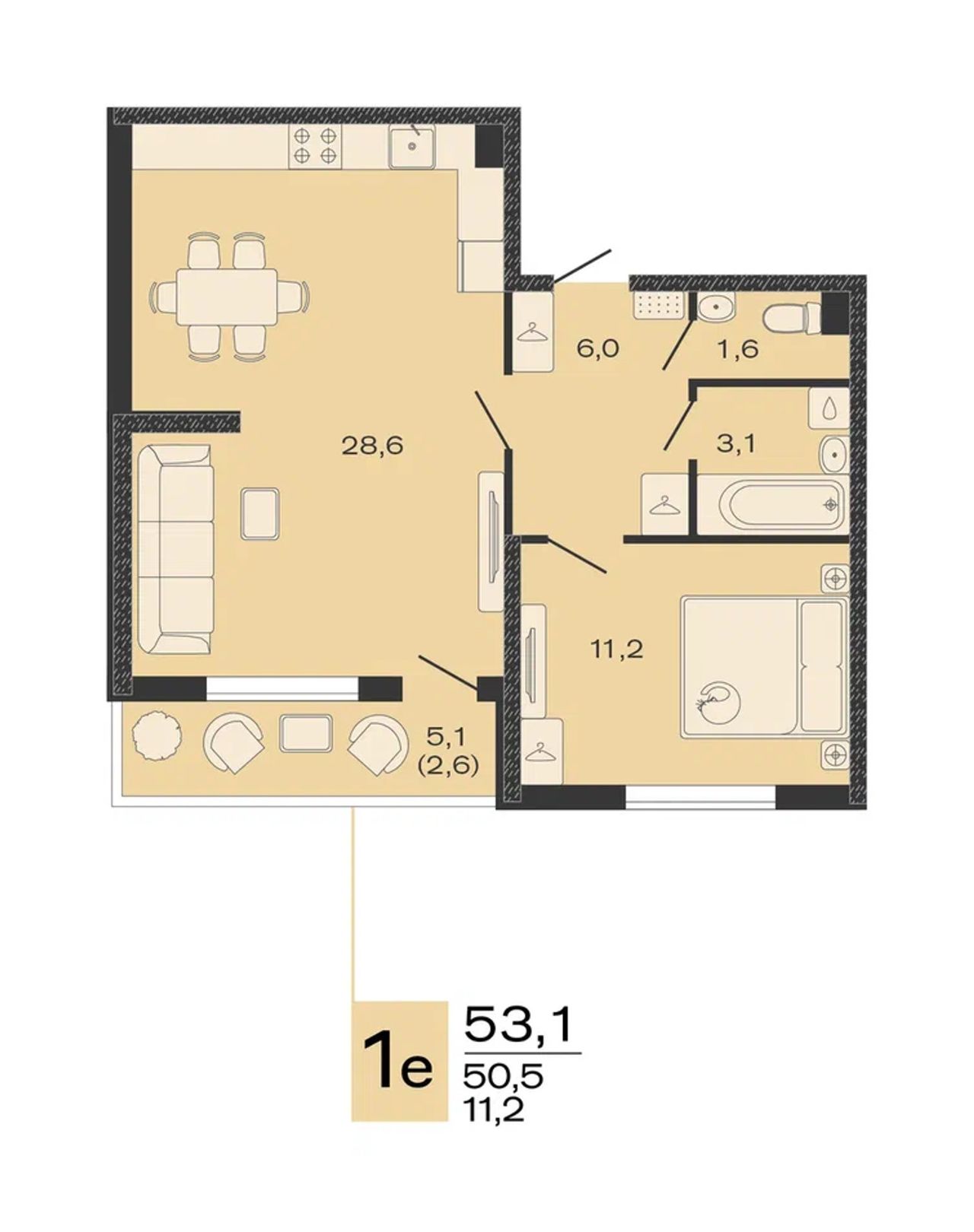 1-комнатная — 53,1 м² 2/4 эт. в Дзенпарк