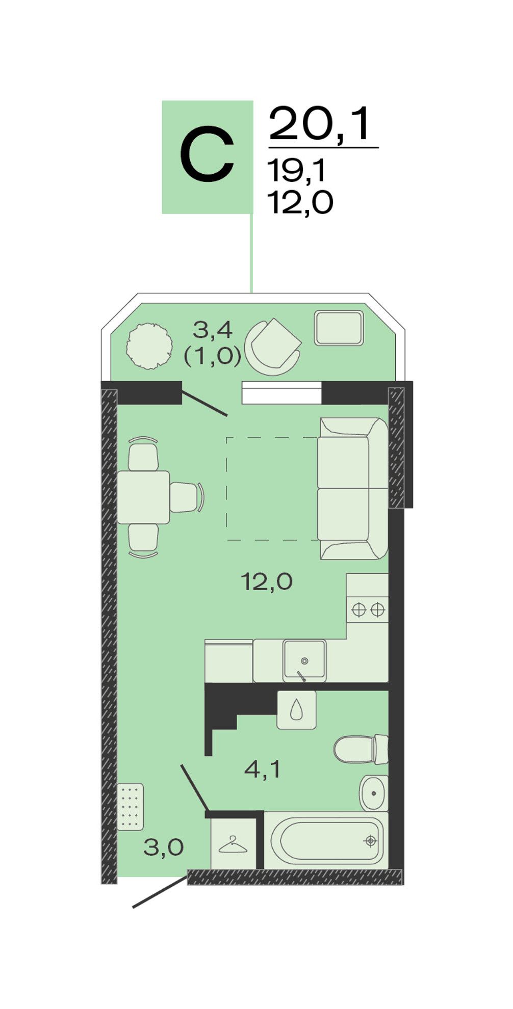 3. Студия, 20,1 м²