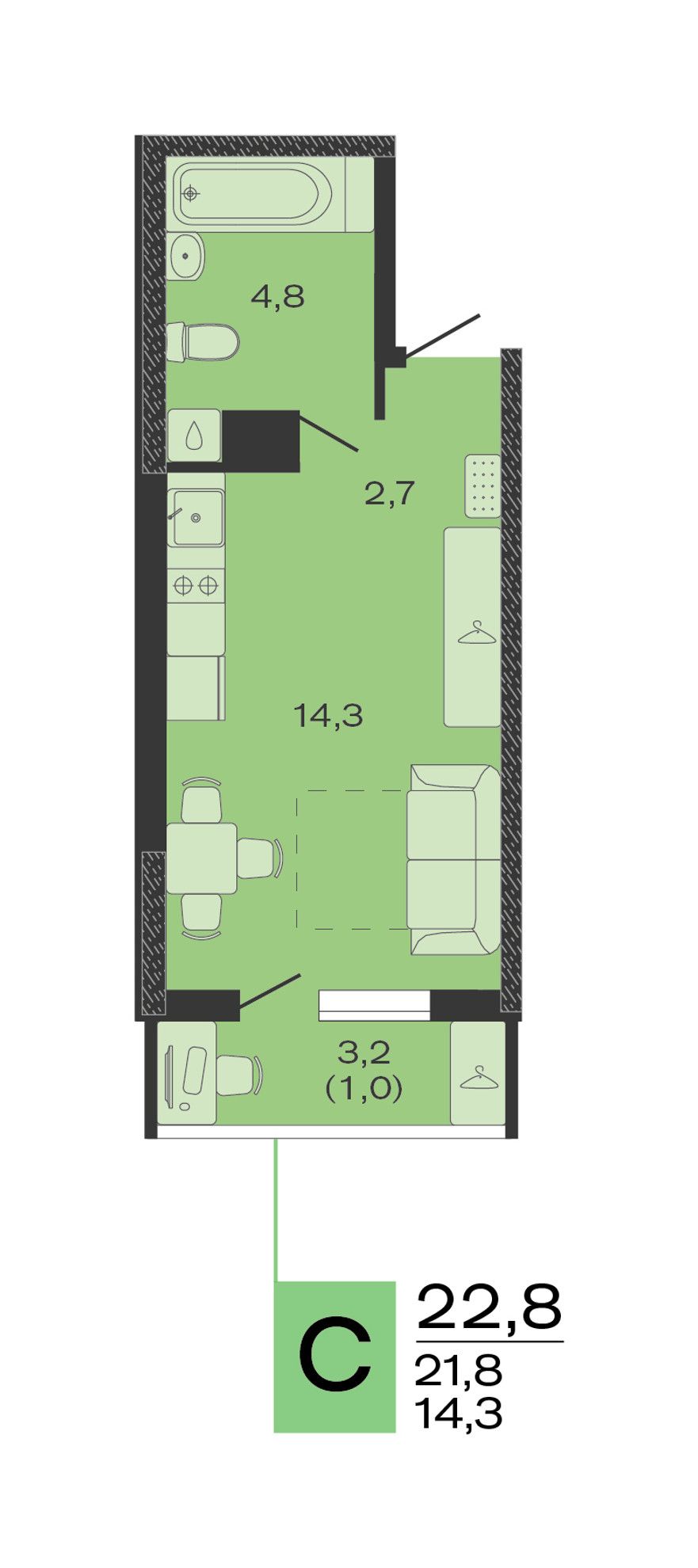 Общая площадь22,8 м²