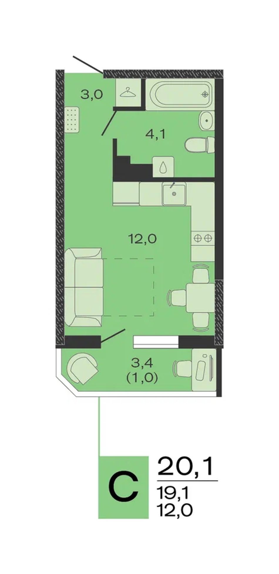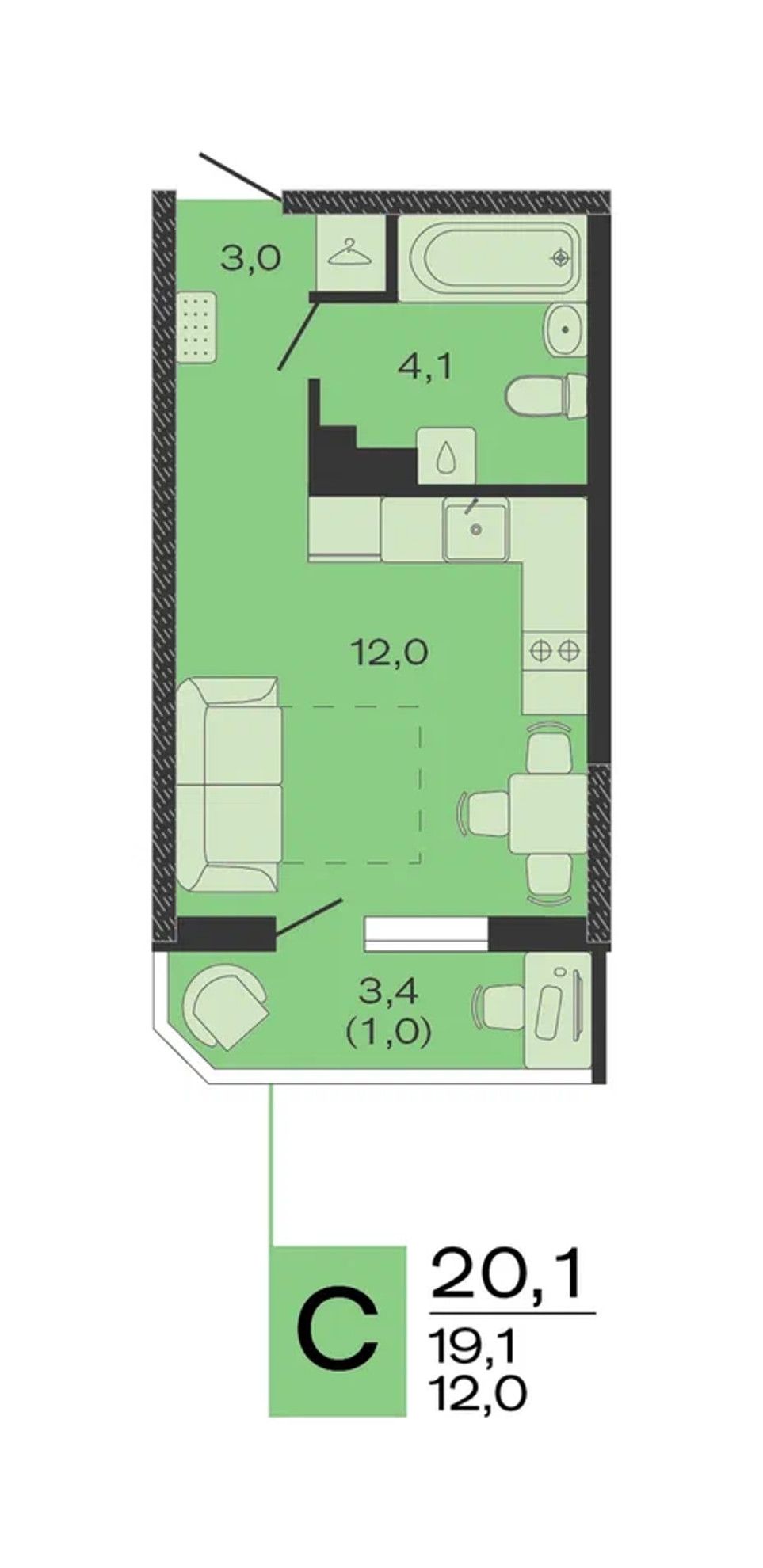 Студия — 20,1 м² 4/4 эт. в Дзенпарк