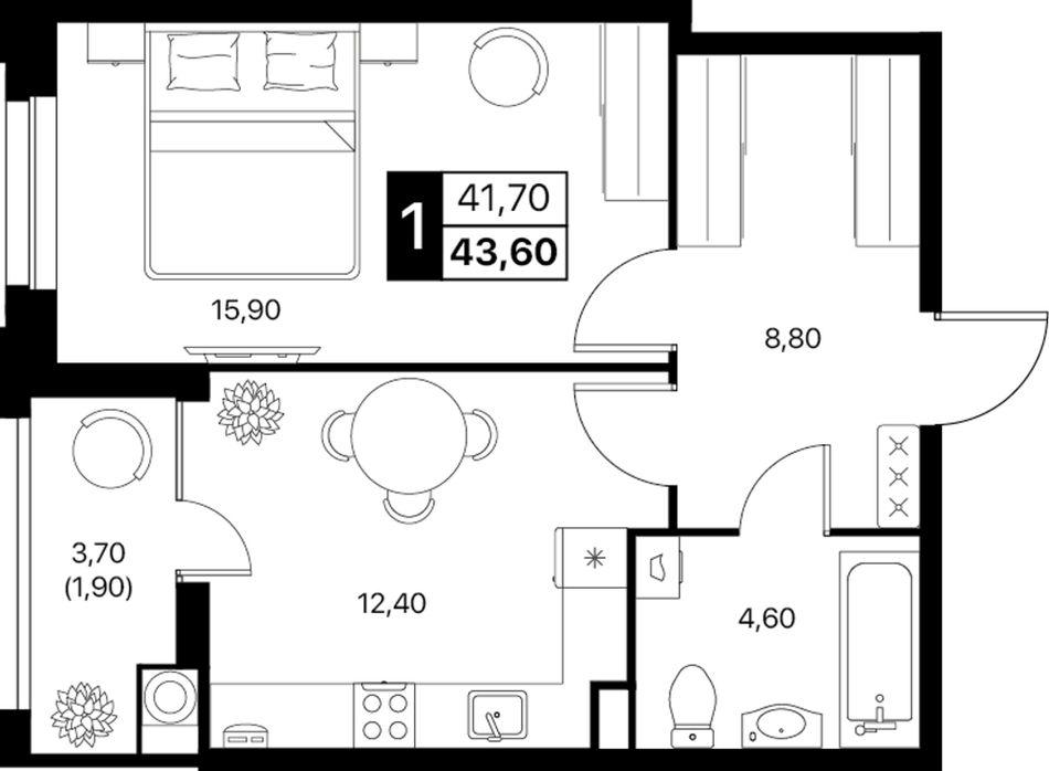 1-комнатная — 43,6 м² 2/20 эт. в Квартал впечатлений Эстет