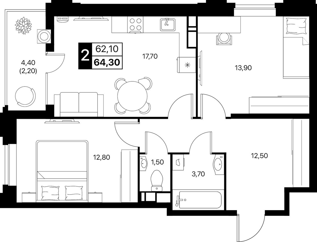 2-комнатная — 64,3 м² 5/12 эт. в Квартал впечатлений Эстет