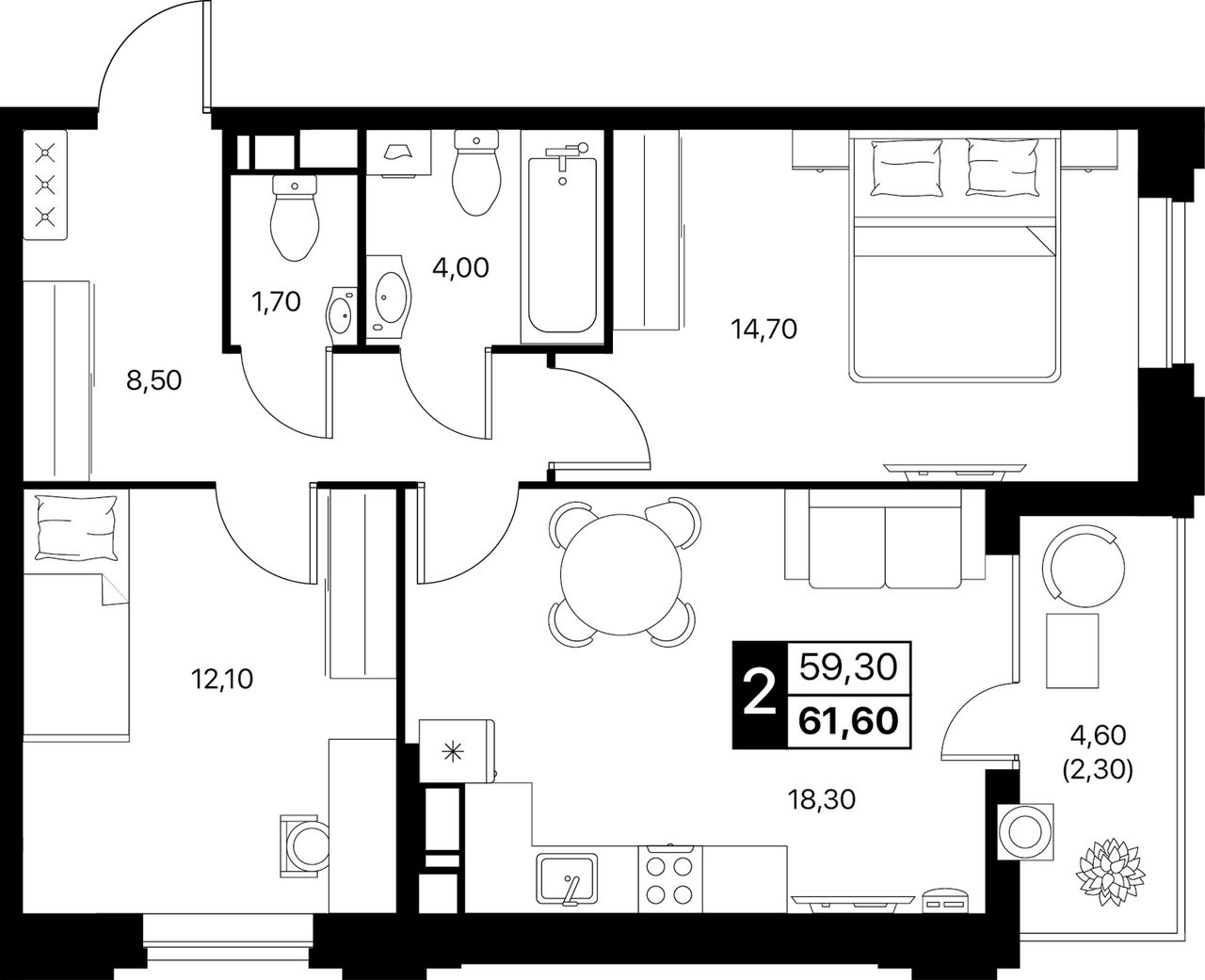 2-комнатная — 61,6 м² 11/12 эт. в Квартал впечатлений Эстет