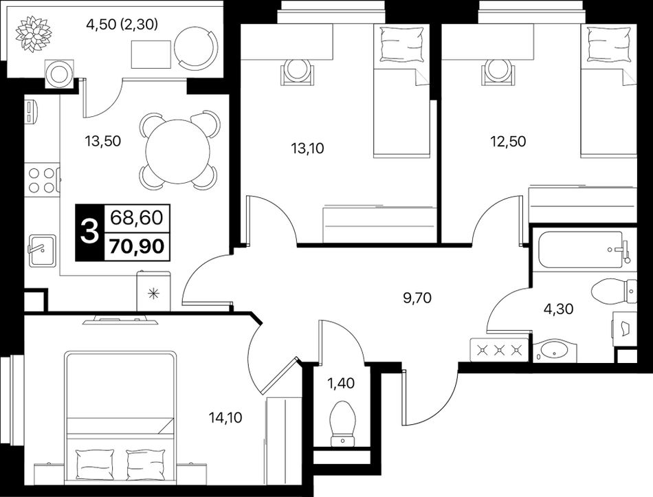 3-комнатная — 70,9 м² 2/12 эт. в Квартал впечатлений Эстет