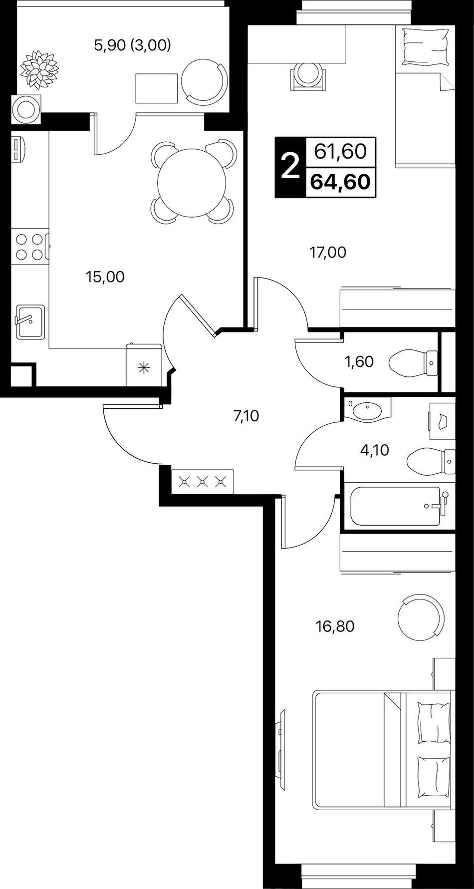 2-комнатная — 64,6 м² 2/12 эт. в Квартал впечатлений Эстет