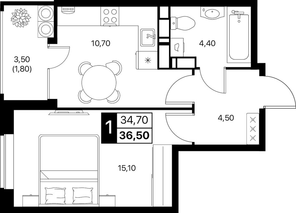 1-комнатная — 36,5 м² 20/12 эт. в Квартал впечатлений Эстет