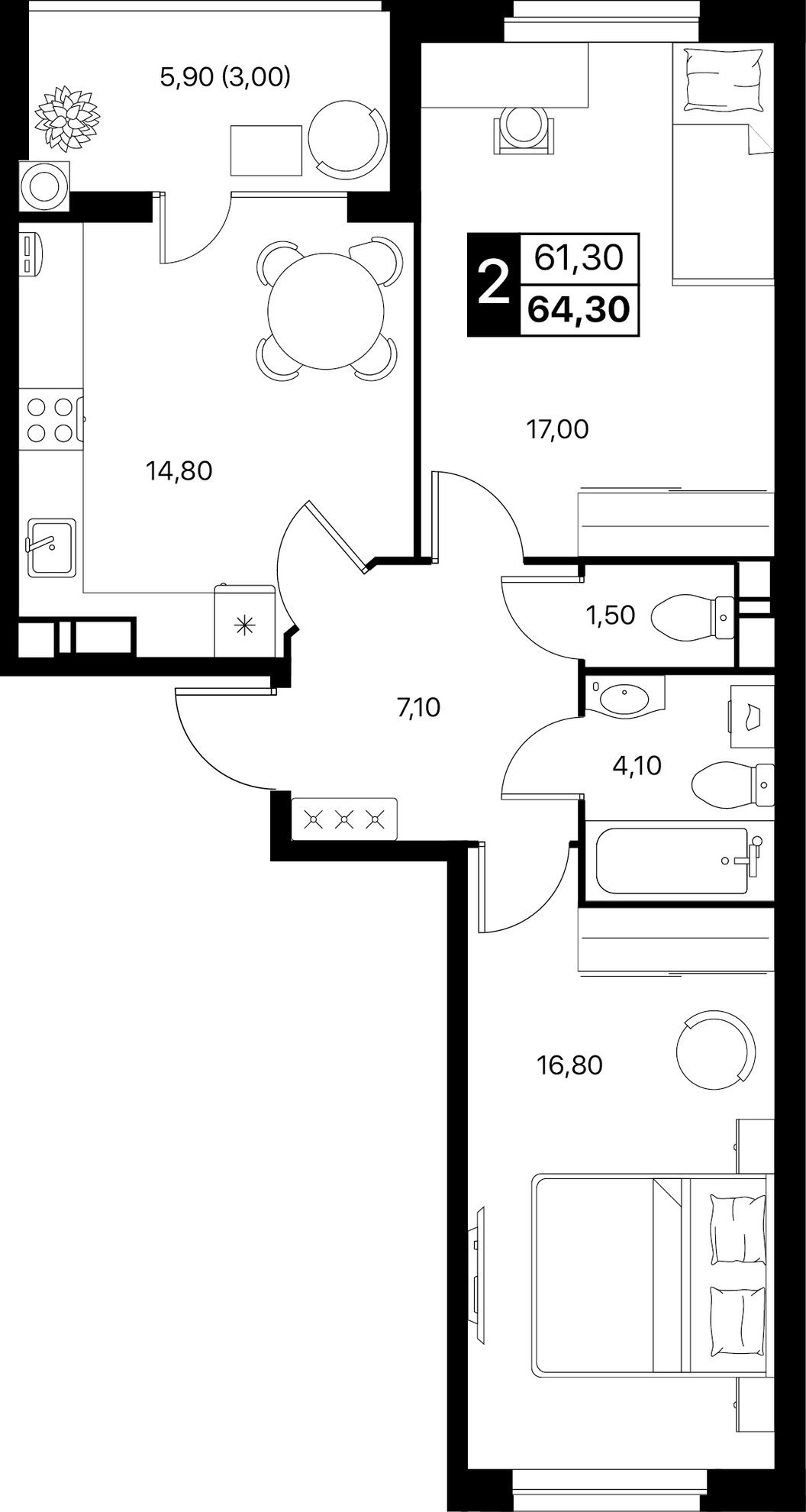 2-комнатная — 64,3 м² 5/12 эт. в Квартал впечатлений Эстет