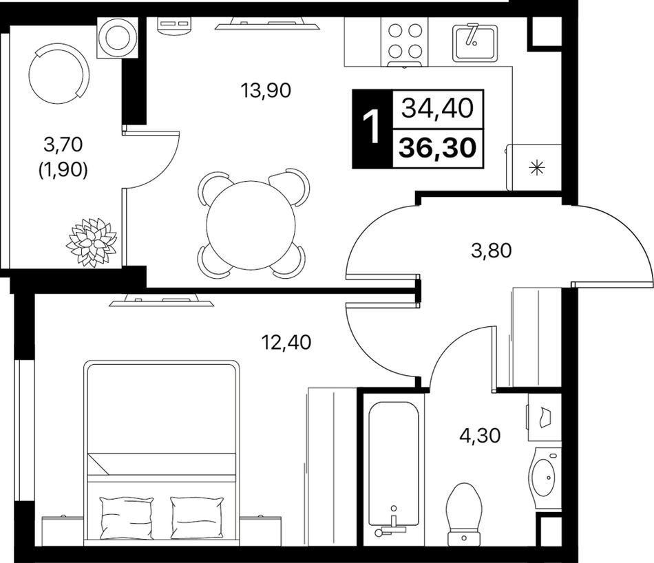 1-комнатная — 36,3 м² 2/12 эт. в Квартал впечатлений Эстет