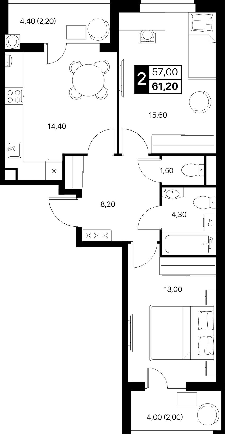 2-комнатная — 61,2 м² 2/12 эт. в Квартал впечатлений Эстет